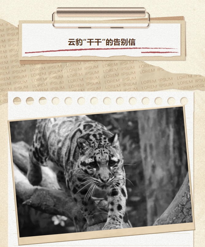 信中写道,亲爱的朋友们:你们好呀!我是云豹 “干干”,此刻,我正怀着满满的不舍,写下这封告别信,与你们说再见。2025年1月19日6时05分,在饲养员温柔的目光和医生关切的守护下,17 岁的我,永远地离开了这个满是温暖与爱的世界。作为国家一级保护野生动物,我的一生被爱紧紧包裹。